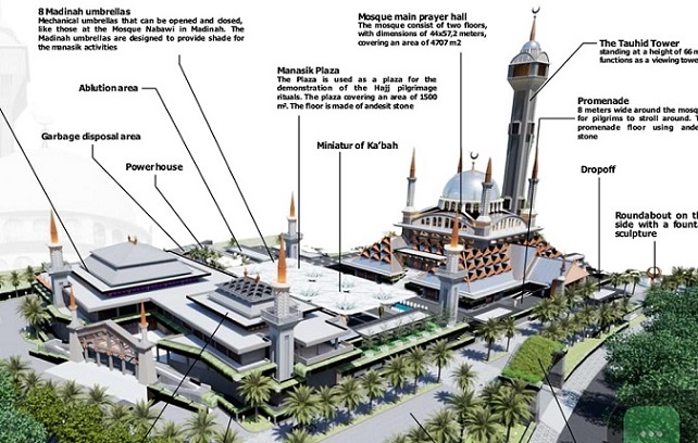 Salah satu fasilitas yang menonjol adalah Menara Tauhid yang memiliki ketinggian 66 meter dan berfungsi sebagai menara pandang. Selain itu, terdapat juga kolam refleksi yang menciptakan suasana yang meditatif, damai, dan indah.